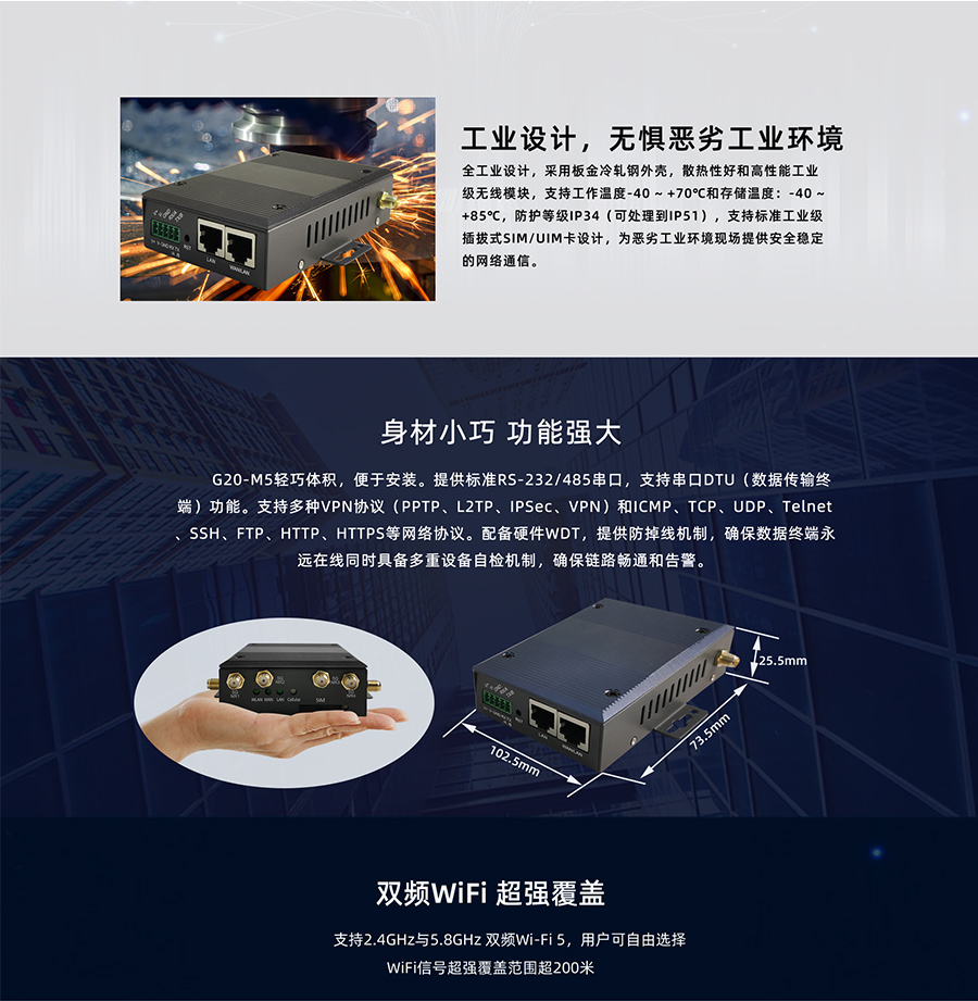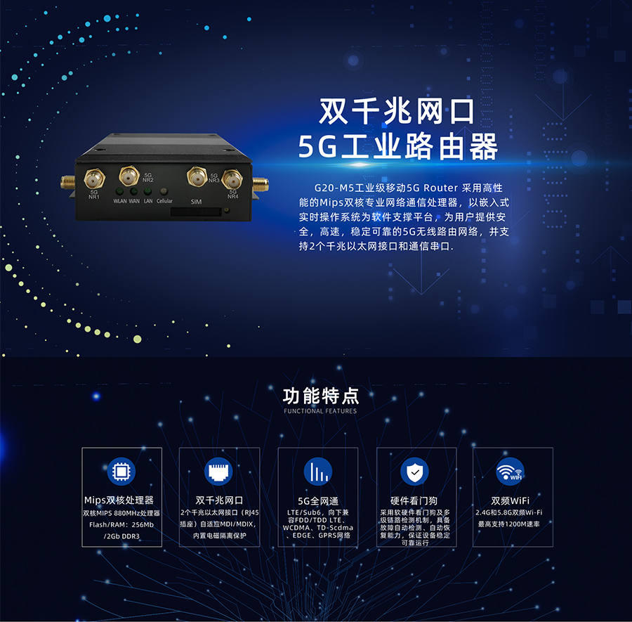 G20-M5是一款物联网无线通信路由器,采用高性能的Mips双核专业网络通信处理器